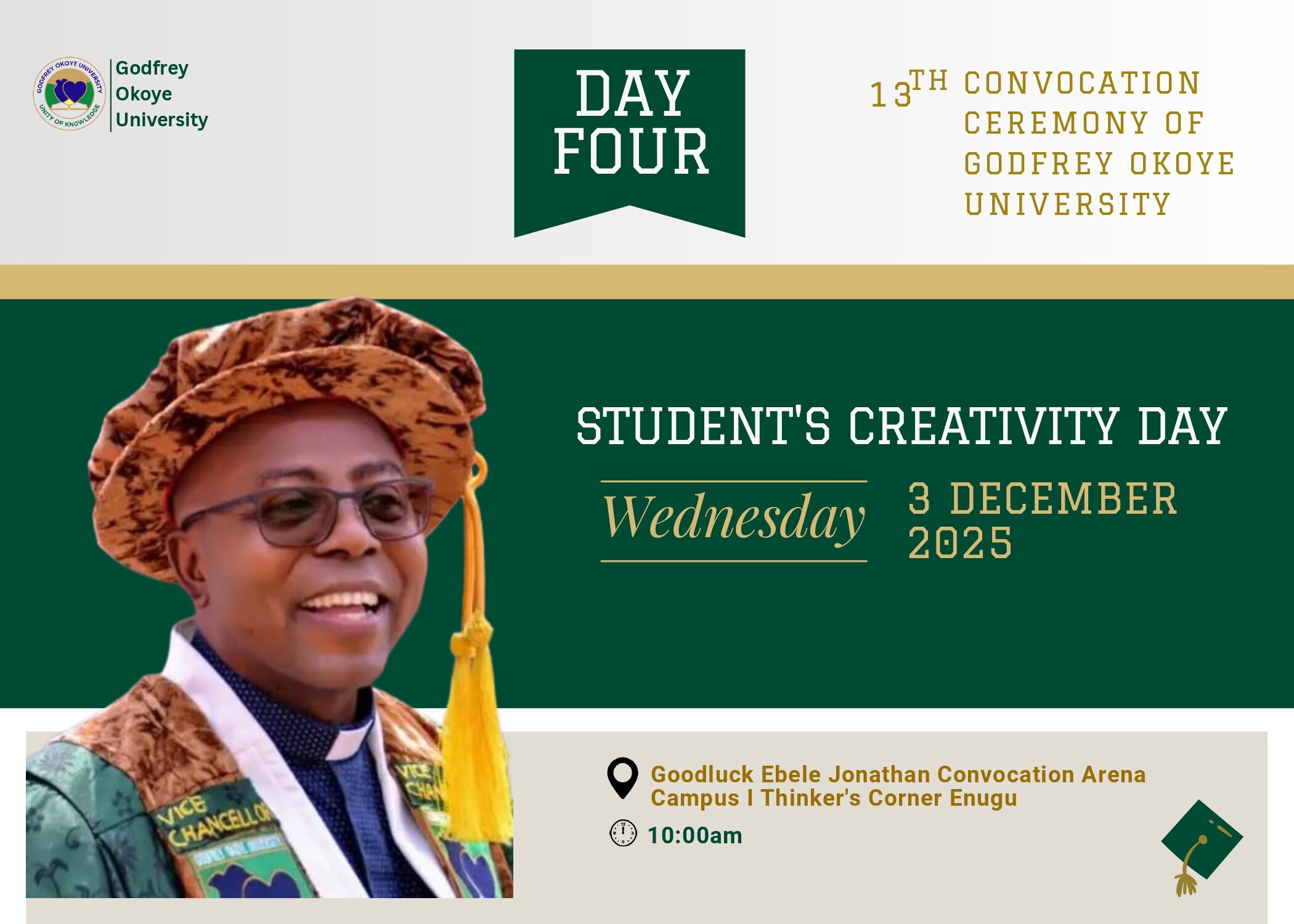 Stop scrolling!Day Four of the 13th Convocation Ceremony of Godfrey Okoye University is here, and it’s all about creativity, innovation, and talent. STUDENT’S CREATIVITY DAYWednesday, 3rd December 2025Goodluck Ebele Jonathan Convocation Arena, Campus 1, Thinker’s Corner, EnuguTime: 10:00am Join us as we celebrate the brilliance of our students, the thinkers, creators, innovators, and change-makers shaping...Read More