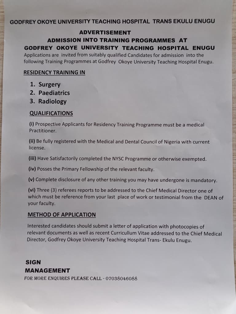Godfrey Okoye University Teaching Hospital (GOUTH), Trans-Ekulu, Enugu, invites applications from suitably qualified medical practitioners for Residency Training Programmes in the following specialties: