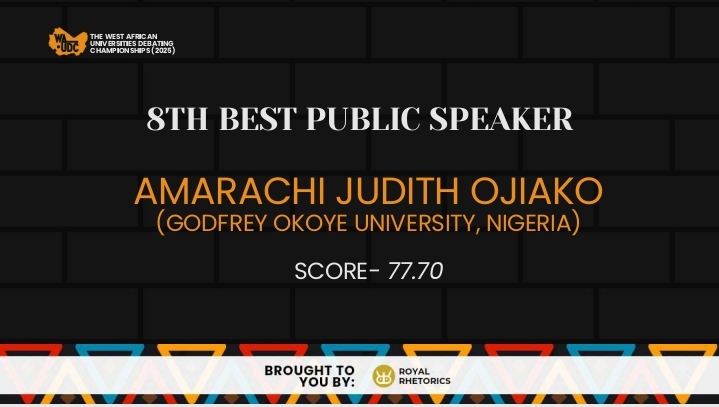 Adding to this triumph, Amarachi Judith Ojiako earned the distinguished title of 8th-Best Public Speaker in West African Universities, a recognition that underscores her eloquence, strategic reasoning, and mastery of high-level rhetorical craft.