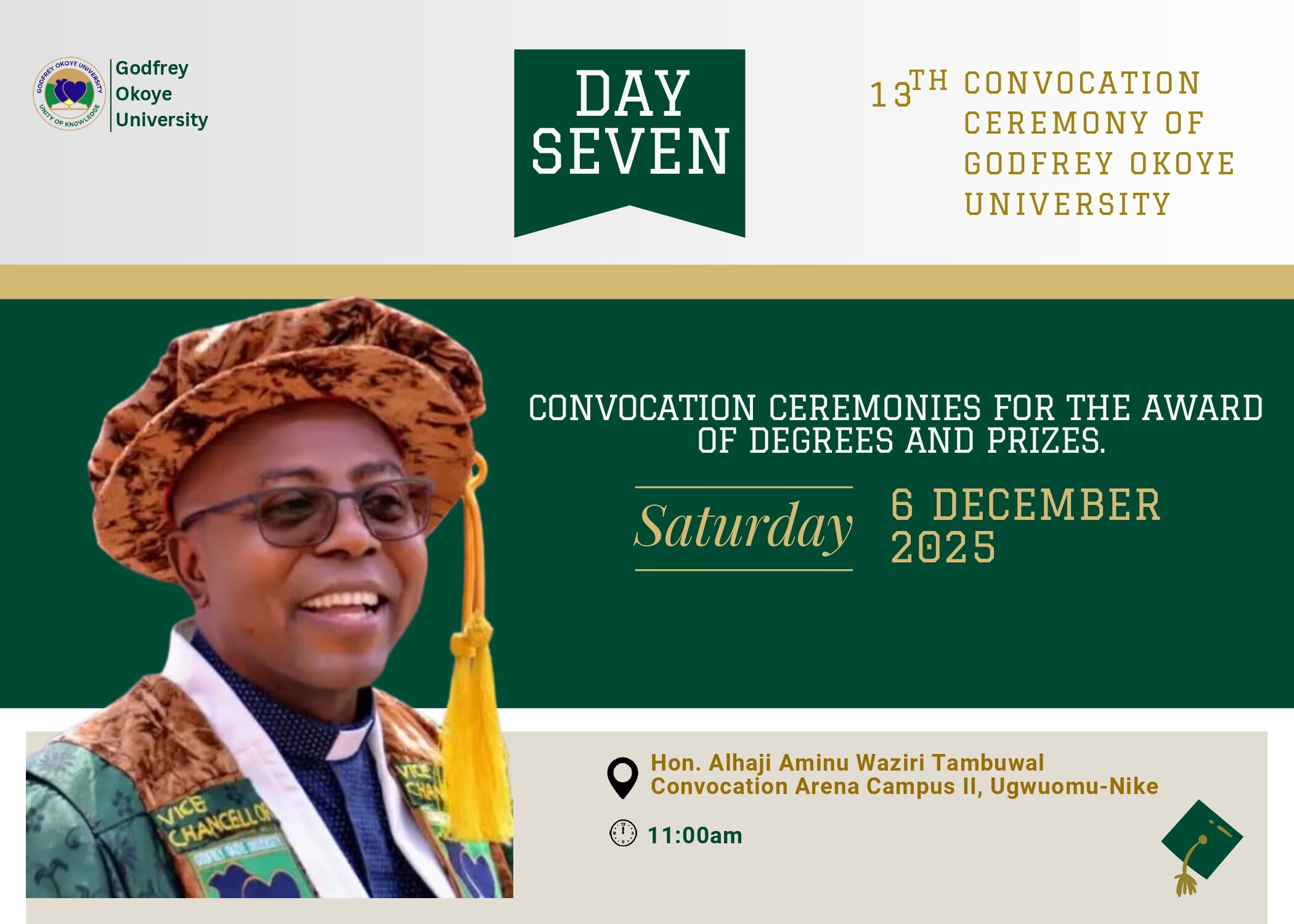 As the 13th Convocation Ceremony draws to a graceful close, the Godfrey Okoye University community invites the public to the Thanksgiving Mass and Closing Ceremonies. Join us as we gather in gratitude for a successful convocation week and celebrate the achievements of our graduates. Date: Sunday, 7 December 2025Time: 10:00amVenue: Ominium Santorum Chaplaincy, Godfrey Okoye...Read More