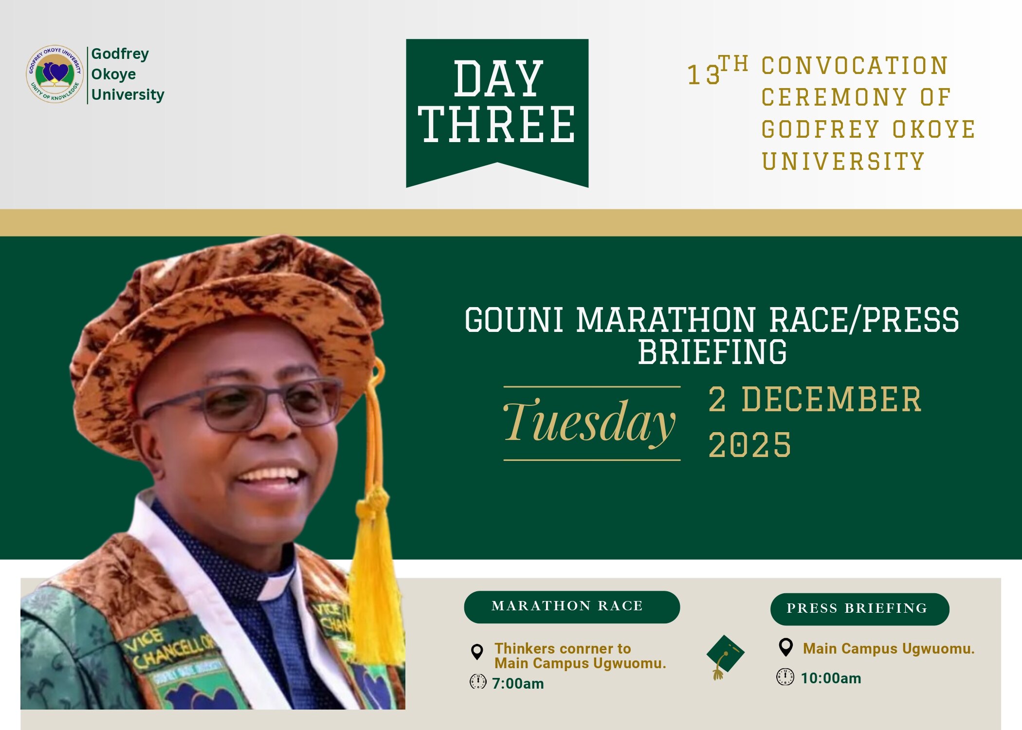 Day Three of the 13th Convocation Ceremony is here, and it’s all about energy, endurance, and excellence. Join us this Tuesday, 2 December 2025, for the GOUNI Marathon Race and Press Briefing as we continue the momentum of this historic week. The marathon kicks off at 7:00am. from Thinkers Corner to the Main Campus, Ugwuomu....Read More