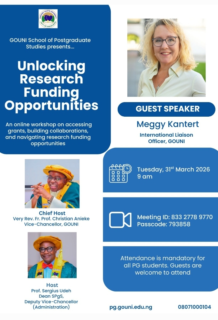 Access to research funding is a vital step in building impactful academic work and advancing innovative ideas. To support postgraduate students in navigating the research funding landscape, the School of Postgraduate Studies, Godfrey Okoye University, is organizing a special workshop titled “Unlocking Research Funding Opportunities.” The workshop will provide practical insights on how to identify...Read More