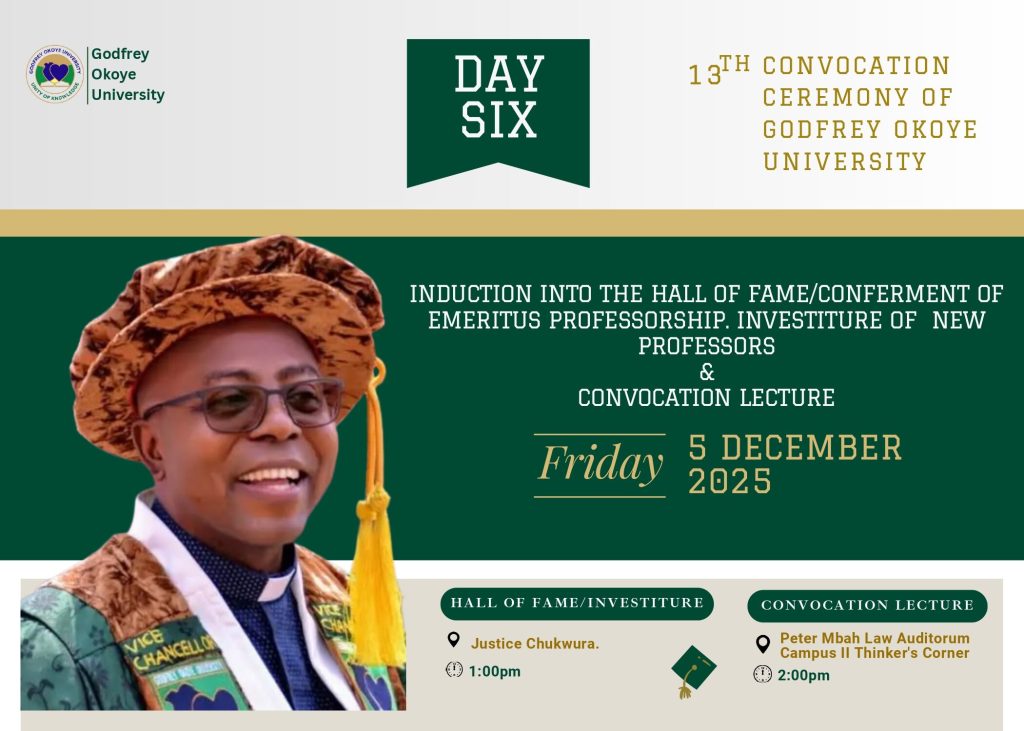 Godfrey Okoye University looks forward to an inspiring and memorable Day Six as we honour exceptional individuals and deepen our academic heritage.
