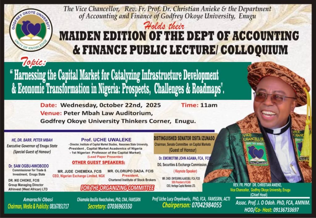 The Vice Chancellor, Rev. Fr. Prof. Christian Anieke, and the Department of Accounting and Finance, warmly invites the entire university community, partners, and the public to the Maiden Edition of the Department of Accounting & Finance Public Lecture/Colloquium, a platform designed to promote dialogue and innovative thinking in finance, economics, and national development.