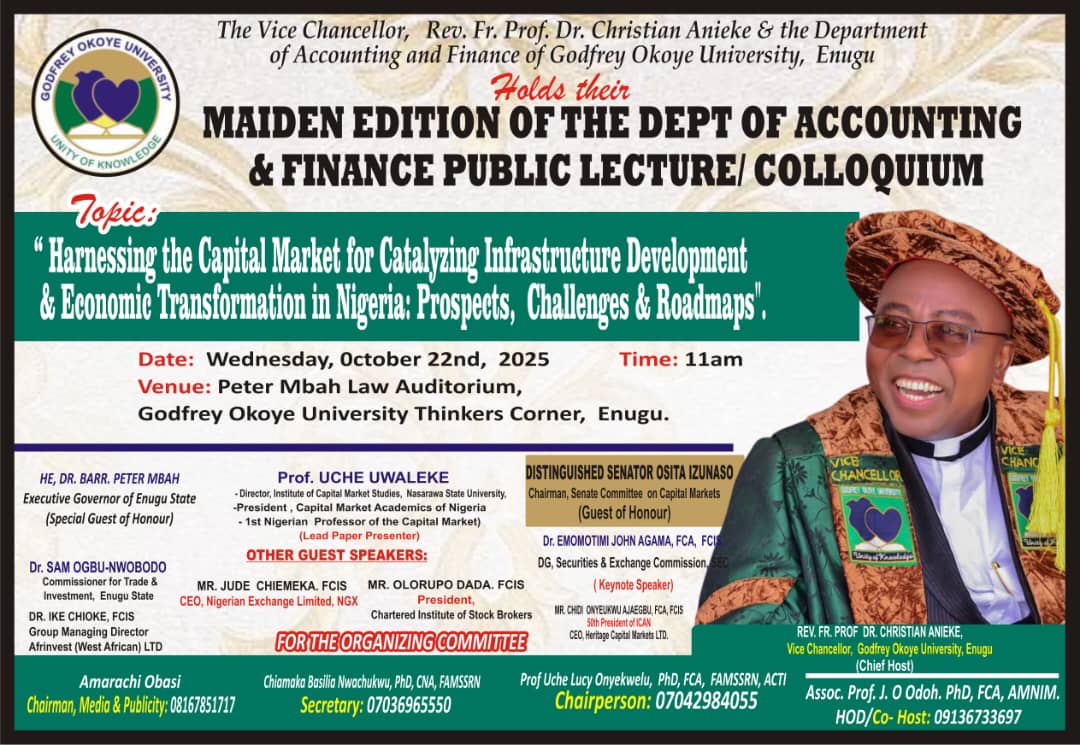 The Vice Chancellor, Rev. Fr. Prof. Christian Anieke, and the Department of Accounting and Finance, warmly invites the entire university community, partners, and the public to the Maiden Edition of the Department of Accounting & Finance Public Lecture/Colloquium, a platform designed to promote dialogue and innovative thinking in finance, economics, and national development.