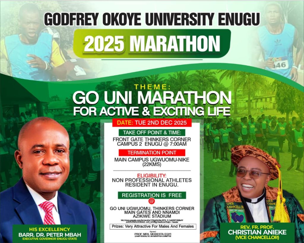 Get set for a thrilling day of energy, endurance, and excitement as Godfrey Okoye University Enugu presents the 2025 Marathon, themed “GO UNI MARATHON FOR ACTIVE & EXCITING LIFE.”