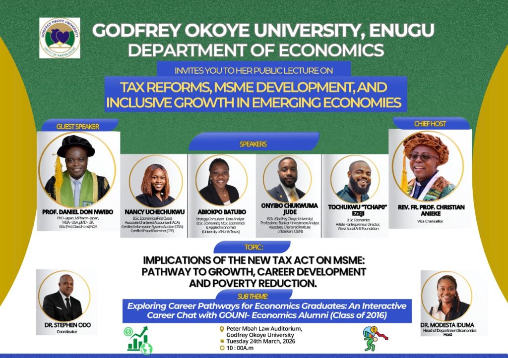 The Department of Economics, Godfrey Okoye University, invites students, academics, entrepreneurs, and the general public to an engaging Public Lecture on Tax Reforms, MSME Development, and Inclusive Growth in Emerging Economies.
