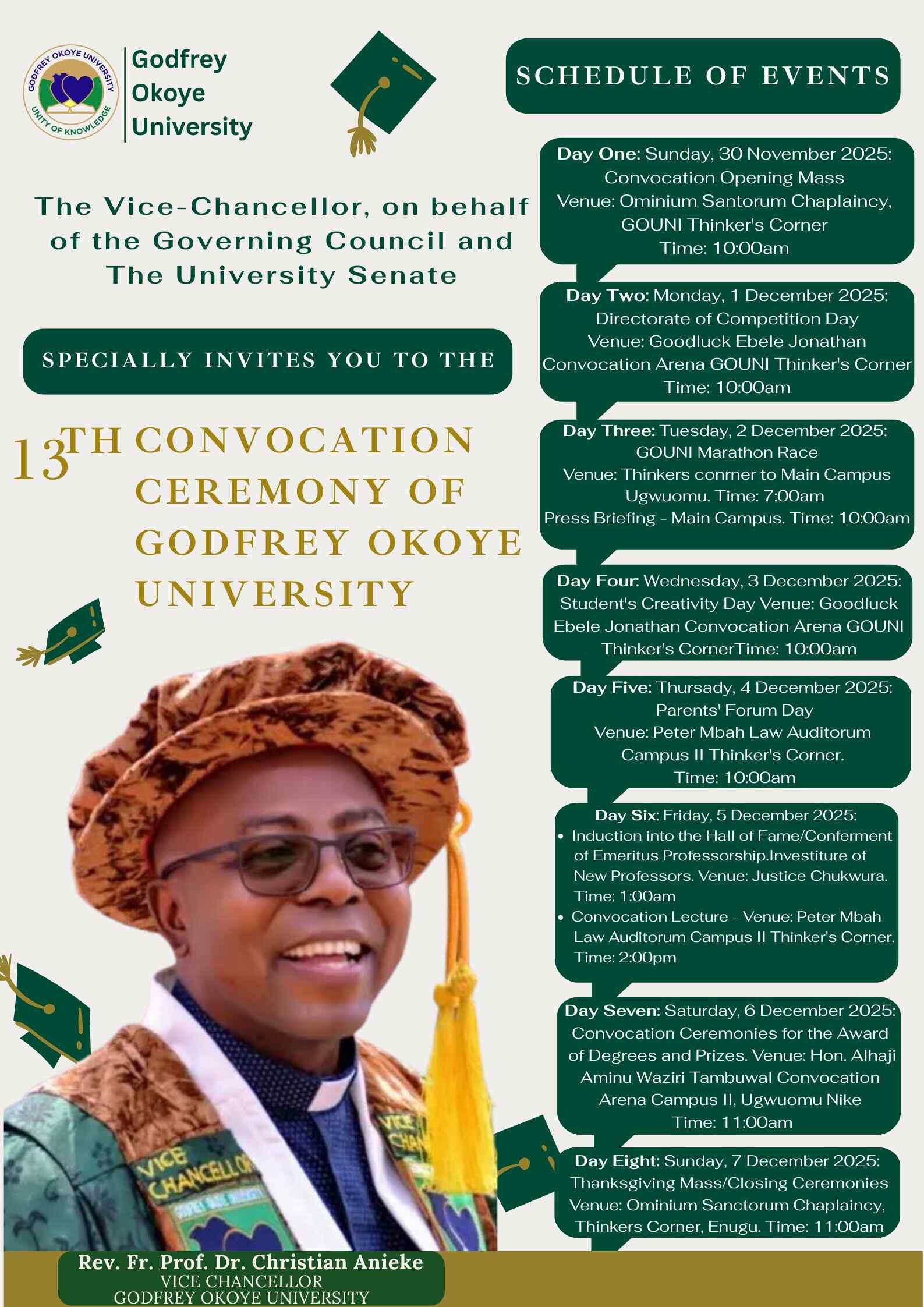 The Vice-Chancellor, on behalf of the Governing Council and Senate of Godfrey Okoye University, warmly invites the public, friends of the university, partners, alumni, parents, and well-wishers to the 13th Convocation Ceremony, a week-long celebration of achievement, creativity, scholarship, and growth.