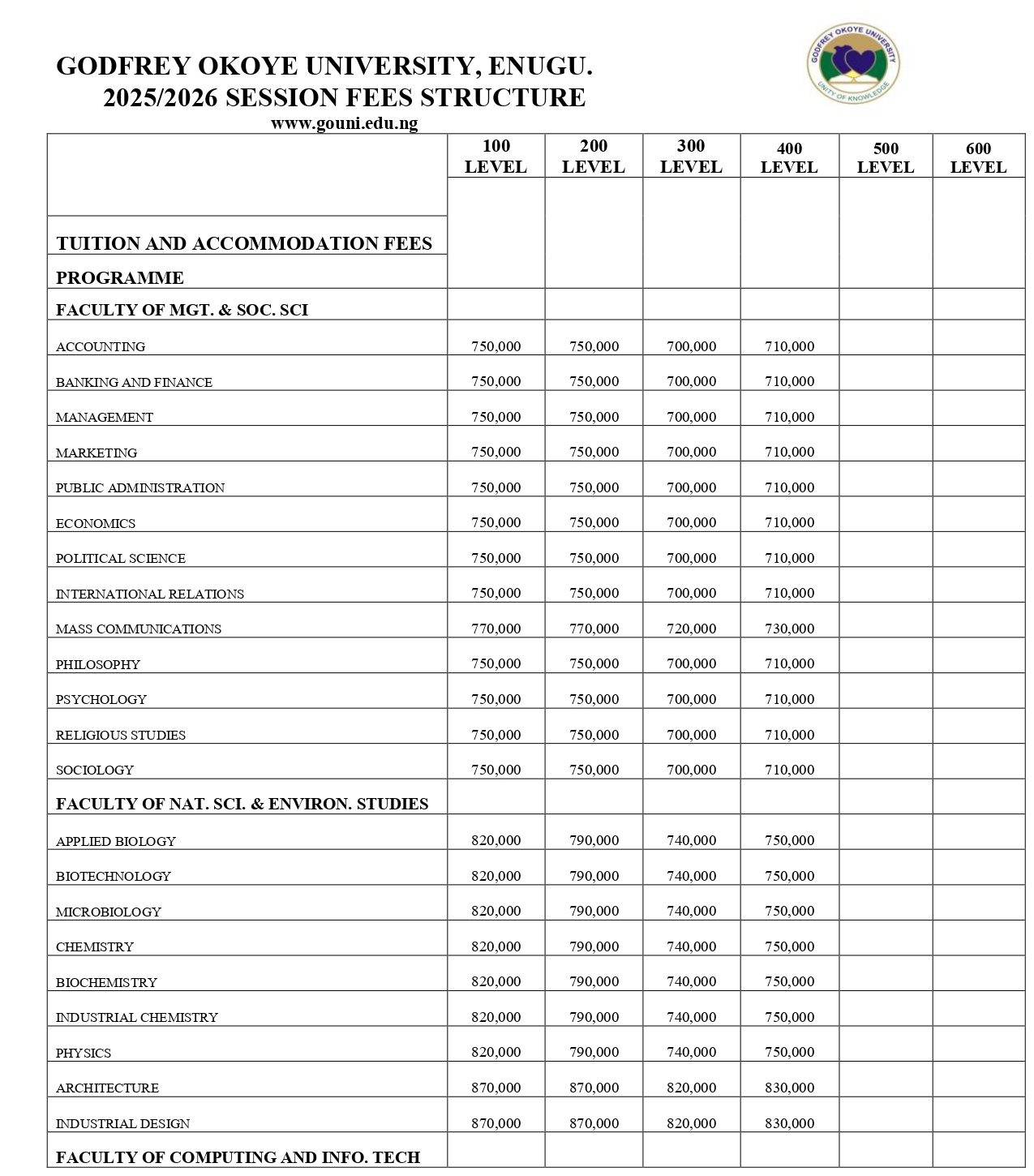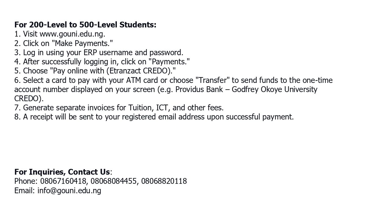 The administration of Godfrey Okoye University mandates every student/prospective student to make payments using the university’s ERP. Any student/prospective student who pays to any personal account will be doing so at his or her disadvantage with no responsibility to Godfrey Okoye University.