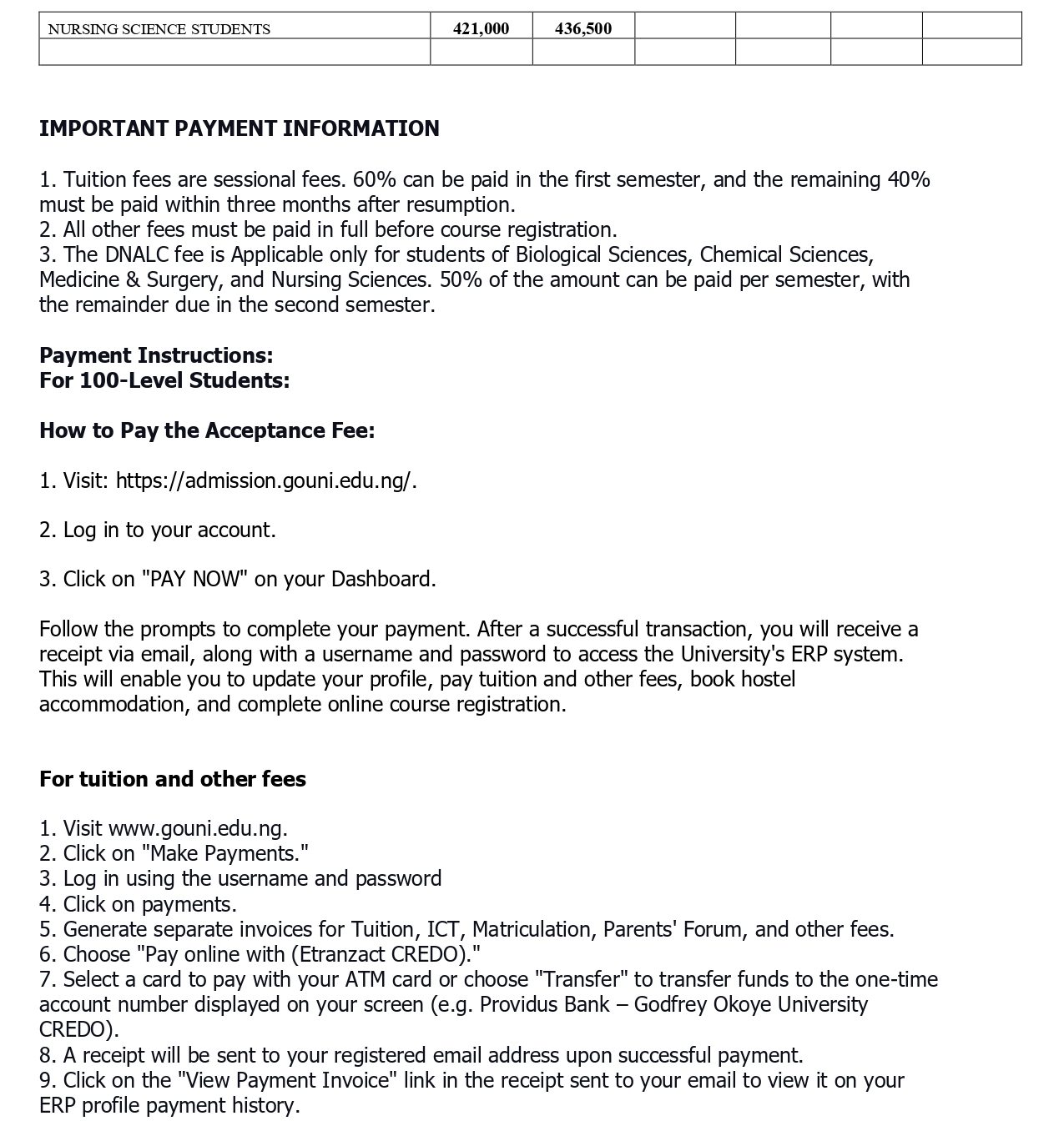 DEAR STUDENTS, GOUNI TUITION FEES ARE SESSIONAL FEES (YEARLY), BUT 60% CAN BE PAID IN 1ST SEMESTER AND 40% BALANCE WITHIN THREE MONTHS . ACCOMMODATION IS ALSO INCLUDED IN TUITION FEES. FOR ENQUIRY, CALL/WHATSAPP: 08067160418, 09134273215, 09121963049. EMAIL: info@gouni.edu.ng